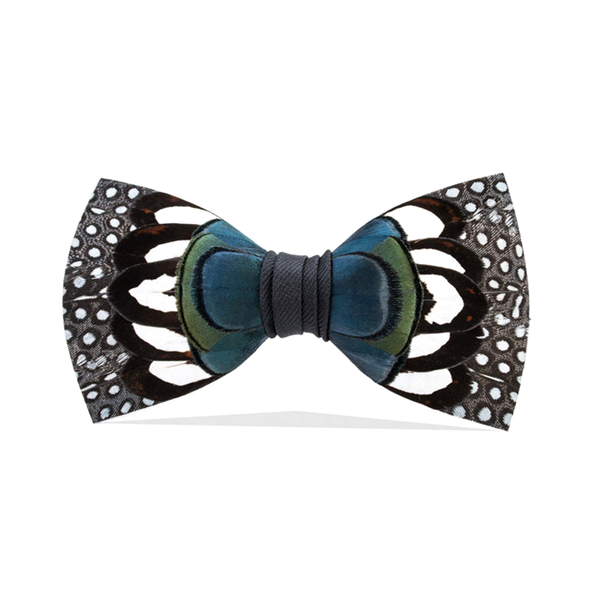 Edisto is a black and blue bow tie crafted with navy, forest green, black, and white pheasant feathers, and grey and white guinea feathers. Center wrap is black grosgrain.