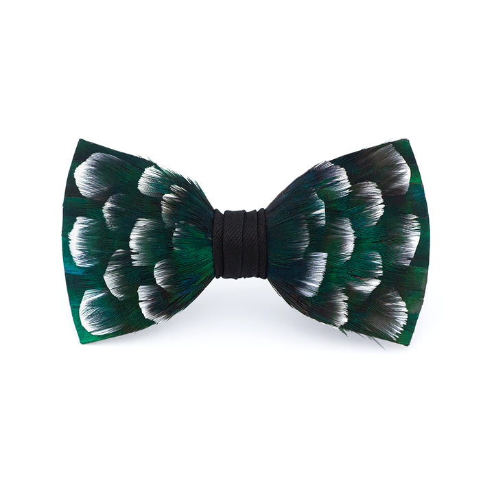 This textured bow tie is crafted from blue and green peacock feathers with pops of white from goose feathers. Using a special technique, this tie highlights the natural fringe quality of these beautiful feathers.