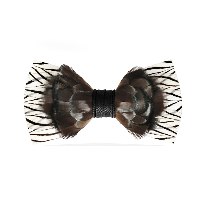 Xander is crafted with black, white and brown pheasant feathers. Center wrap is black grosgrain.
